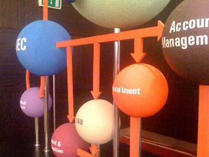 The model was to represent a 3D training chart, consisting of polystyrene balls and arrows to lead the client around the training points. Many different materials and model making techniques were used in the production of this model; the base and arrows were produced from MDF and painted black and orange respectively prior to assembly; chrome plated tube was cut to length to provide support and stability to the entire model; and polystyrene balls were used as the main points of information.