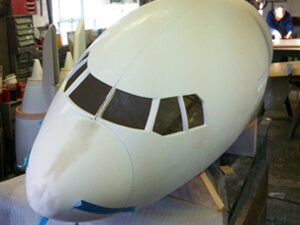 the week the workshop began to look like an aeroplane graveyard; the only difference being, this plane was slowly coming to life. The fuselage was manufactured from four sections of polystyrene, hot wire cut and coated in veneer, while the nose and tail sections were machined on one of our CNC machining centre out of model board, or ureol. As sections came off the five axis machine they received a five star treatment from our expert model makers, who polished and joined them together and any seam filled and sanded down. Once a seamless finish was completed, the process of creating a hollow fibreglass fuselage began; this created a smooth and durable structure that will travel well, while also being light enough to cost effectively ship overseas. The high precision elements of the model, such as the engines, wheels and wing tips, were manufactured from ureol using our five-axis CNC machining centre due to the intricate detail that can be achieved.